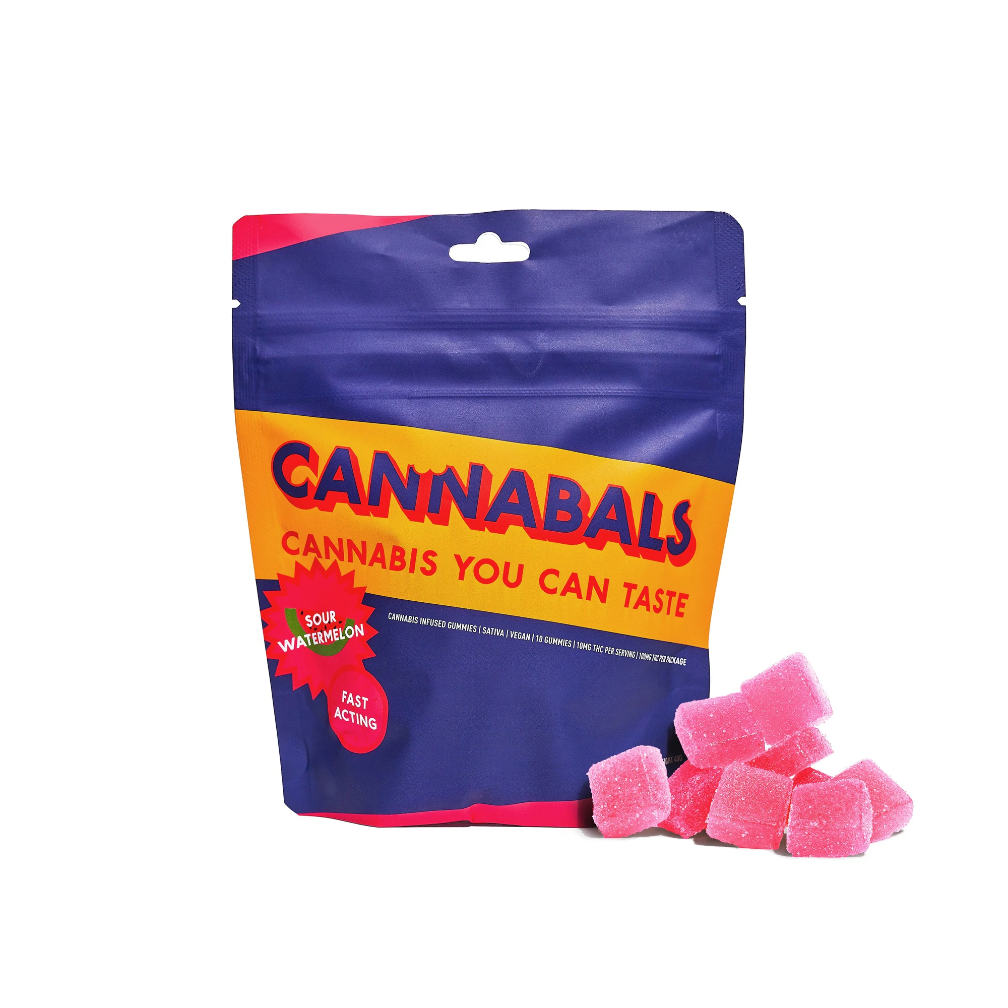 Don’t wait to enjoy the countless benefits of cannabis with CANNABALS “Cannabis you can eat!” fast acting Sour Watermelon flavored sativa gummies. Enjoy 10 vegan gummies per package, each delivering 10mg of nano-emulsified water-soluble THC, with real fruit flavor in every bite!
