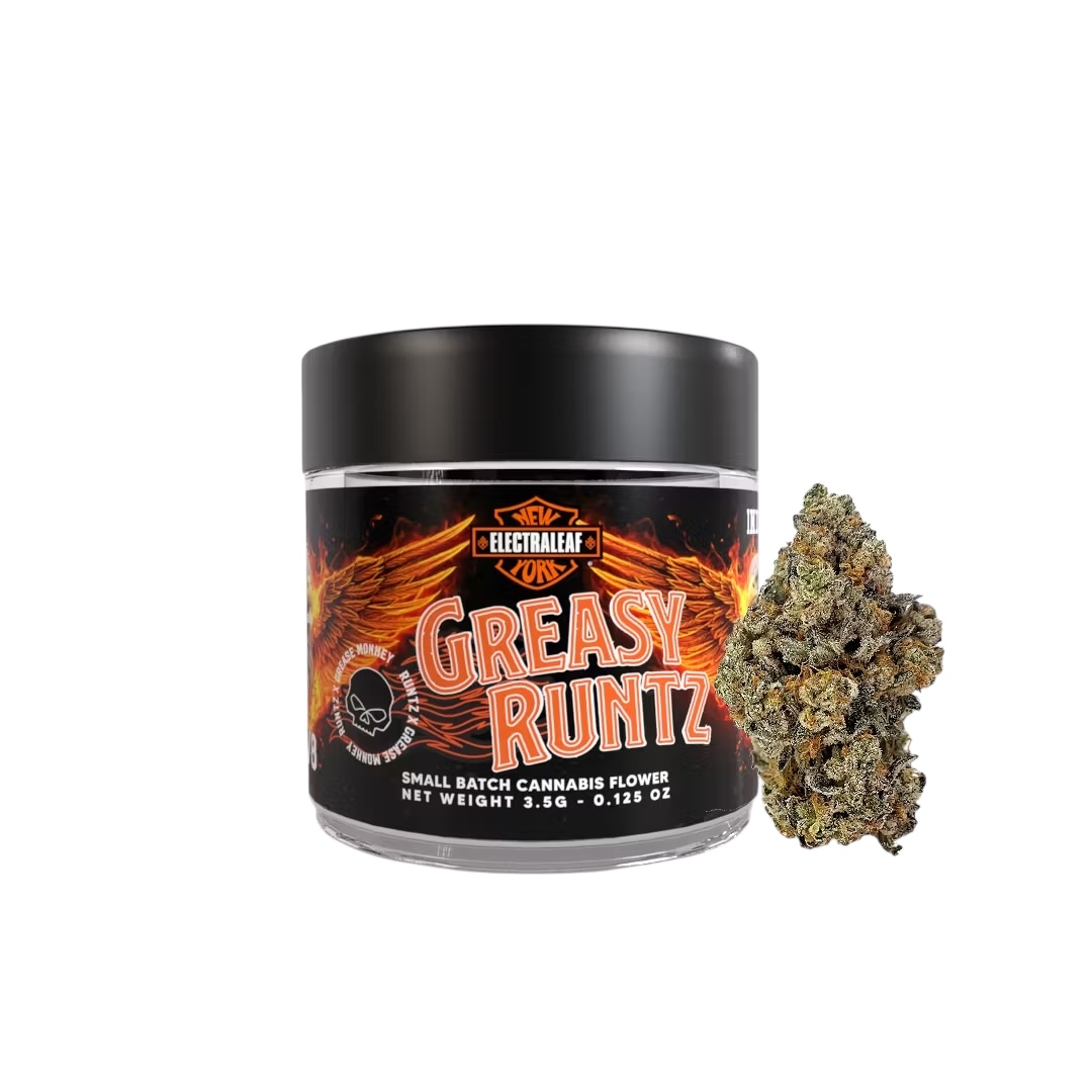 Discover the exceptional Greasy Runtz flower at Puro Vita, Brooklyn's premier legal cannabis dispensary located on Flushing Avenue. This stunning 3.5g offering showcases an indica-dominant hybrid that masterfully combines Runtz and Grease Monkey genetics, delivering THC levels consistently exceeding 20% for an unforgettable cannabis experience.