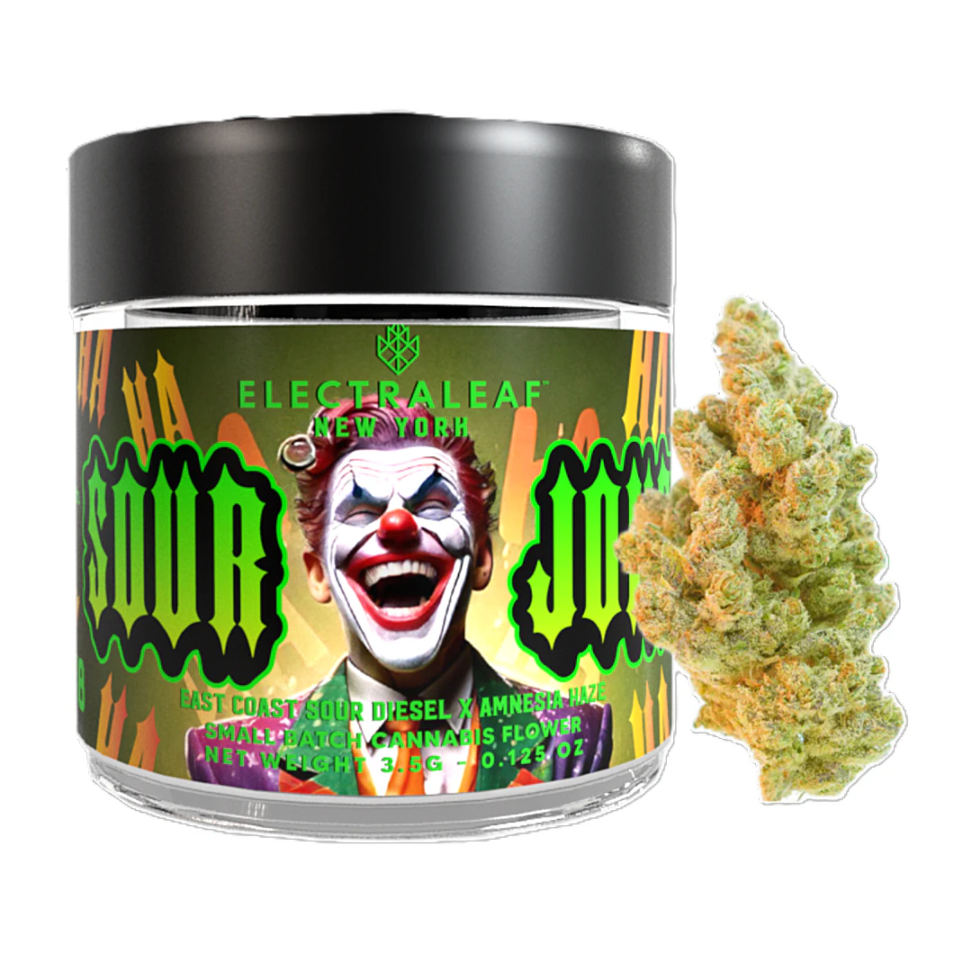 Experience pure joy with Sour Joker, a premium 3.5g sativa dominant hybrid available at Puro Vita, Brooklyn's trusted legal cannabis dispensary on Flushing Ave. This expertly crafted strain combines the legendary genetics of Amnesia Haze and East Coast Sour Diesel, delivering an exceptional cannabis experience that lives up to its playful name.