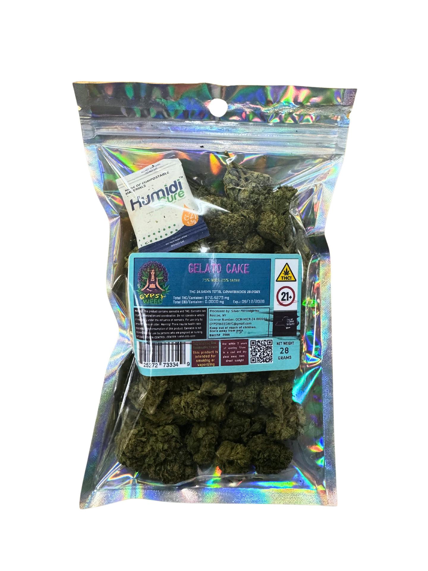 Gelato Cake delivers an exceptional indica-dominant experience with its impressive 75% indica and 25% sativa genetics. This premium 28-gram flower offering combines the legendary Gelato #33 with Wedding Cake, creating a member of the renowned Cookie strain family that's beloved throughout North America.