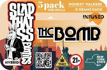 Enjoy five 0.5g Donkey Walkers infused with THC Bomb. This citrus-flavored hybrid offers balanced effects, combining relaxing body sensations with uplifting cerebral stimulation for an energizing yet euphoric experience.